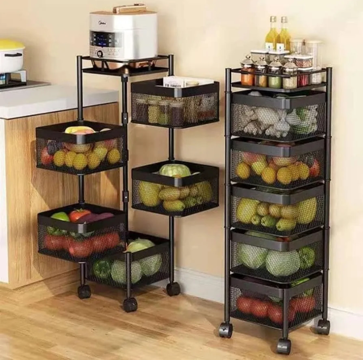 Product details of 5 Layers Kitchen Rotating Shelf 360 Degree Baskets Fruit Vegetable Storage Rack Floor Round Shelf With Wheels ColourBlackNumber of shelves5Room typeBathroom, Bedroom, Kitchen, Laundry Room, Living Room, Office, RoomAssembly required NoMounting typeFloor MountAbout this item Metal carbon steel material, anti-scratch and anti-rust, super load-bearing, stable and not shaking, large capacity, strong and durable, not easy to deform.. Movable and fixed, universal wheel and foot pad, quiet and smooth without hurting the floor, with brake universal wheel, 360-degree free movement, smooth movement, easy to clean and store Breathable mesh blue, semi-perspective mesh window, strong air permeability, not messy, hollow design around the edge, thick and thick, top storage, high temperature resistance and no deformation, can be used for rice cookers, pots, seasoning bottles, etc.. Out-of-the-box, no installation required, one second rotation to open, seasonings, vegetables and fruits, snacks, small appliances, etc. are stored in one rack, the space is rationally used, no gaps are left, and more storage is possible. Multifunctional, rotating basket design, more convenient for rotating storage, widely used, can be placed in the kitchen, bedroom, living room, bathroom, toy room, laundry room, office. Can hold food, condiments, tableware, household items, cleaning supplies, etc.Material-Carbon SteelWeight- 5.9Hight: 38 inche Length: 13.5 inche